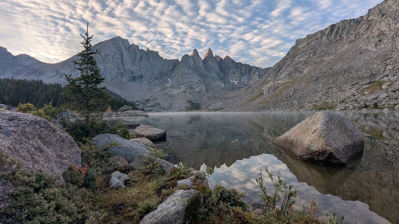 Write Up:Our group of 8 finished 2 backpacking loops in the Wind River Range. We had a great group with lots of laughs, even when the trail became challenging with "type B" fun. The teamwork among the group was impressive, a refreshing sight to see with individuals who literally just met the day before. The views were incredible, and pictures can't capture the beauty of the Wind River Range. It's a place you have to experience in person to appreciate, and I'm so thankful I was able to explore the area with a fun group from the AOC. 62.49 miles and 9,901 elevation gain that included off-trail, rocky passes at a ridiculous grade and bouldering along a few lake