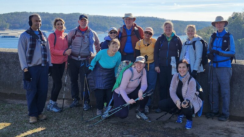 Starting right on time at 8:30 a.m., our great group of 12 headed up the Backpacking Trail on Pine Mountain toward the David Archer Overlook. From there, we made our way down to Cooper’s Furnace for a short snack break. Next came the big climb up to the Visitor Center, where we stopped for a group photo at the overlook above Allatoona Dam.