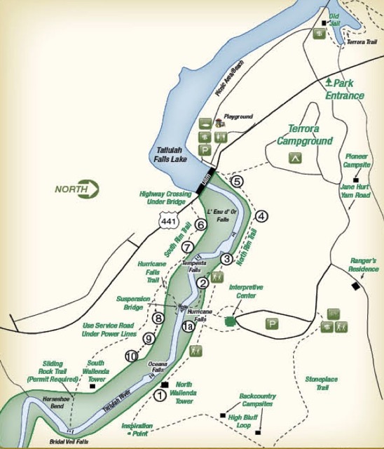 Segment 1 - Listen & Learn We will start at the visitor center, and take the permit 30 minutes class Segment 2 - Steps Pounding We start the adventure by going to overlook #2 on North Rim, go down 347 metal steps, cross the suspension bridge , go down another 221 steps to Hurricane Falls. Then, we climb 568 steps to get on the South Rim. Segment 3 - boulder Scrambling Arrive to South Wallenda Tower, Here is where we start the best part of this adventure: The Sliding Rock Trail, we will scrambl down the rocks and boulders to the gorge floor at Bridail Veil Falls, and scramble back up again. The scramble is 0.5 miles long each direction, 800 feet elevation change each way. Segment 4 - Overlooks Overload A brief walk to all the overlooks on the rim backwards, from overlook 10 all the way back to overlook 1 and Inspiration Point. Segment 5 - Picnicking Lunch at the picnic tables by the Interpretive center